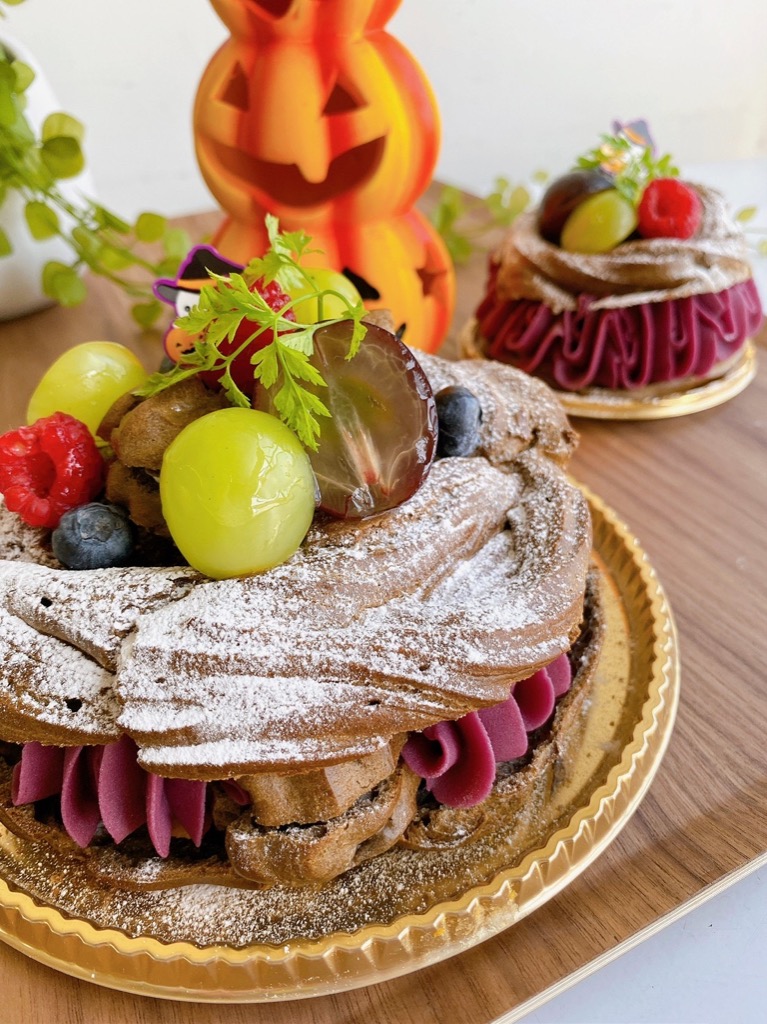 明日からの新メニューができました👏👏👏💕紫芋のエクレアです!あとパリブレストも久しぶりにやります👩🍳完全予約制なので3日前までには連絡お願いします🙏✨✨10月なのでハロウィンをイメージしました😆周りには紫芋のクリーム中にはかぼちゃクリーム、そして生クリームが入っています🥰ピオーネや、シャインマスカットも乗って秋の味覚盛りだくさんでお楽しみいただけると思いますっ!!サイズは2種類5号サイズ3,800円 ミニは800円です👻