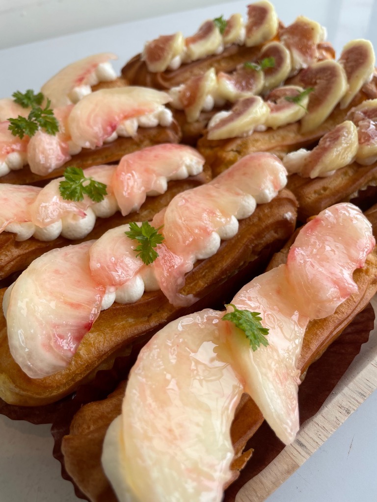 雨ですね😭☔️それでもNOBANAは営業しています!足元悪いですがもし来られる方は気をつけてお越しください🥰お待ちしております!写真は大人気桃のエクレアといちぢくのエクレア💕